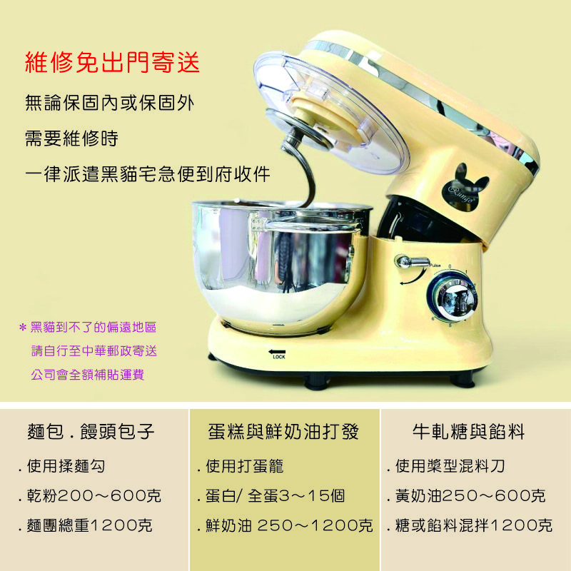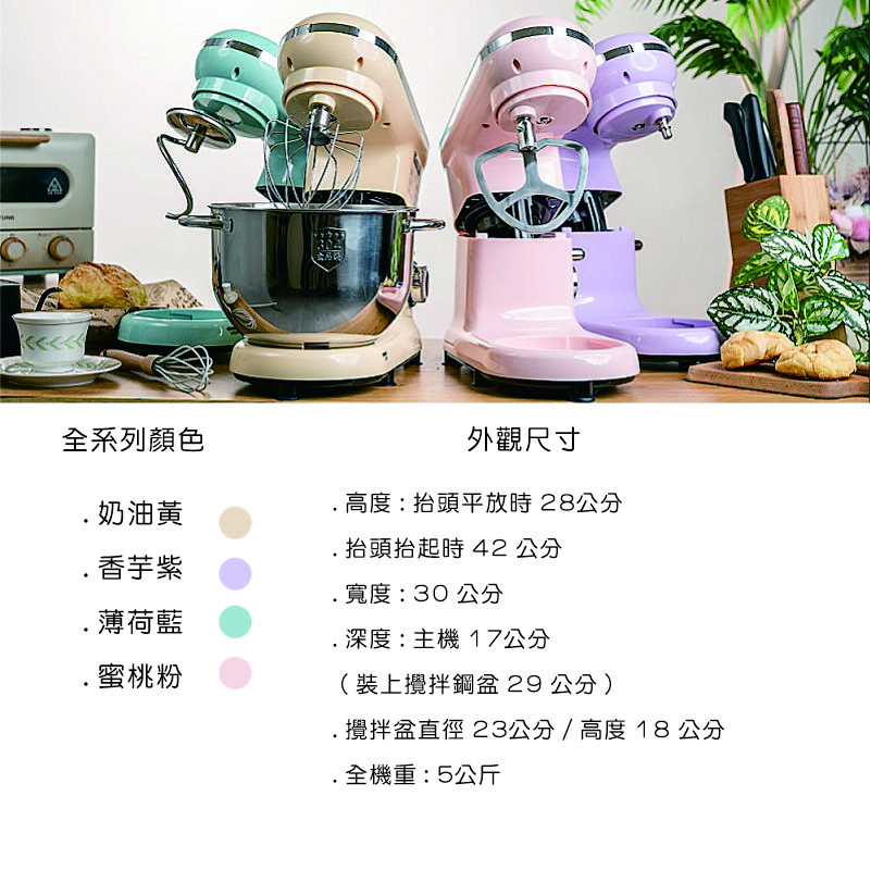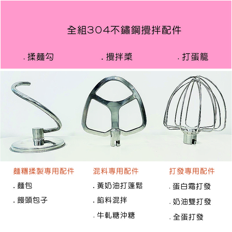 . 產品配件 : 攪拌缸、揉麵勾、打蛋籠、混料刀
