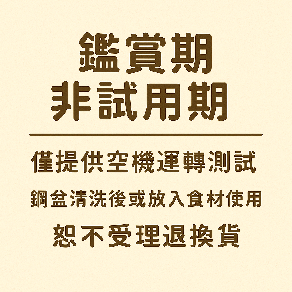 依據消保法規定,我們提供七天猶豫期,收到商品可以檢查商品是否完整,但猶豫期並非是試用期,尤其這是食物調理性商品,攸關衛生與安全,所以不接受試用,因為一旦啟用,鋼盆就會有使用痕跡,商品就等於是舊品,為確保每一個客戶都是買到全新商品,我們不提供試用,建議您購買前還是審慎思考。商品出貨後僅提供未使用狀態以及商品配件齊全包裝完整時可退換貨。