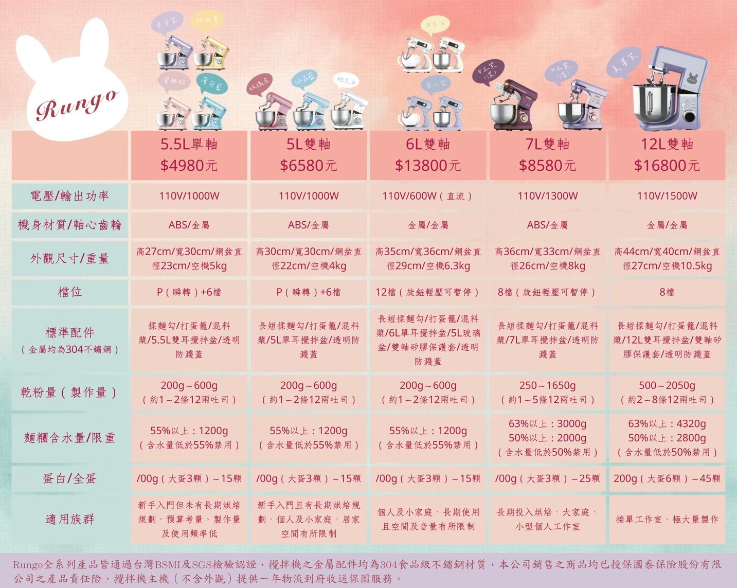 2. 鋼盆清洗請使用軟質海綿以洗碗精清洗兩次即可,請勿使用酸性溶劑洗滌包含醋酸類都不可以用來洗滌鋼盆。攪拌機檔位使用規範:攪拌麵糰:請依據產品說明書規範正確使用產品*請勿超速,超量使用攪拌機,未依照正確使用方式致使攪拌機損毀時,均不在免費保固責任內,須額外付費維修。